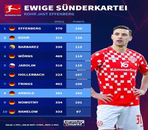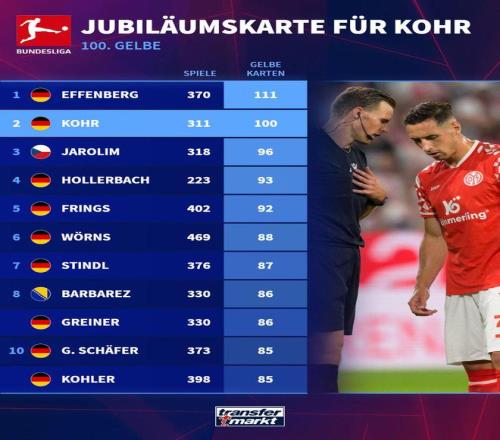 在不久前结束的德甲第6轮比赛中,美因茨客场0比4惨败汉堡,而球队后防大将多米尼克-科尔在本场比赛中领到一张黄牌,再次登上了德甲历史榜单。