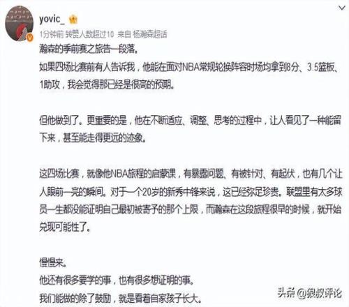 媒体人付政浩发文点评:虽然瀚森在菜鸟赛季就摘得CBA最佳防守球员殊荣,但不得不承认的是,NBA级别的运动能力、防守吹罚尺度和身体对抗对瀚森的移动速率提出了更高要求。
