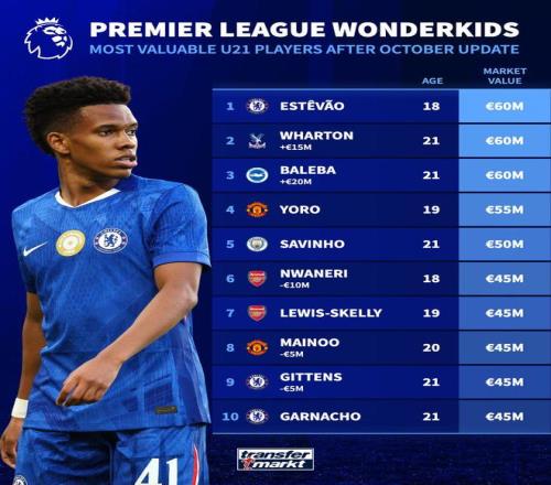 在更新了英超球员身价后,德国转会市场网站列出了U21球员身价榜,埃斯特旺、沃顿和巴莱巴以6000万欧居首。