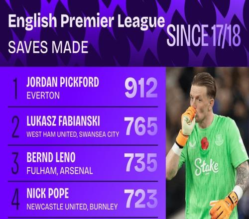 英超自1718赛季以来门将扑救榜:皮克福德第1,德赫亚上榜